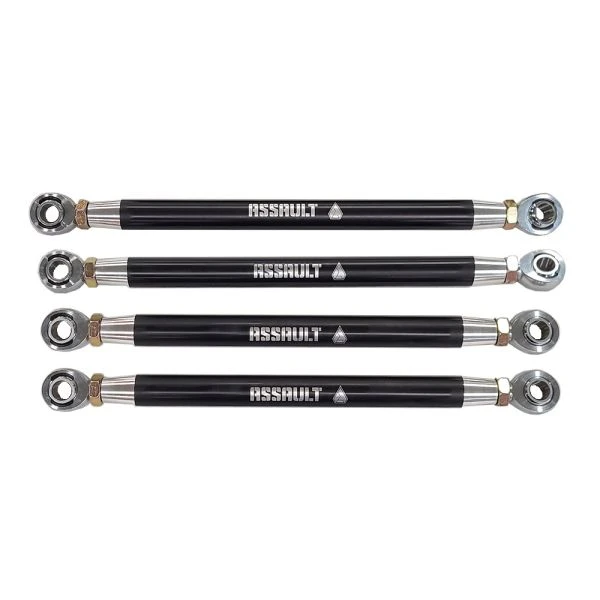 Fitment: Honda Talon 1000X. The Assault Industries barrel style heavy duty radius rods for Honda Talon are designed and manufactured in California using state-of-the-art machinery and aircraft grade materials. This kit retains OEM clearance but adds 3x the strength and rigidity over the factory setup. Assault Industries radius rods are machined from 6061 T6 aluminum and hard anodized black with polished chromoly adjustable Heim joints. We offer a standard (Recreational spec) kit for vehicle owners that want to install their rods with minimal maintenance requirements as they are set up as right/right tread configuration so if the locking nuts break loose the rods will not unthread themselves.