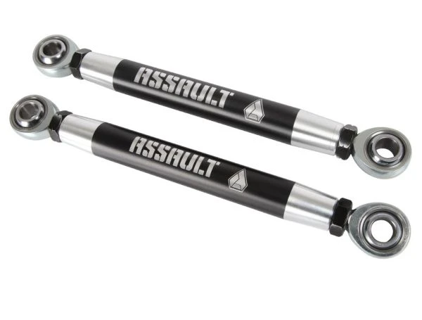 Fitment: Honda Talon 1000R. Assault Industries heavy duty sway bar End Links for Honda Talon are lightweight, rugged and fully adjustable. These end links are designed to replace the more flimsy OEM units and provide improved handling. Integrating a high degree of adjustability enables you to dial in the exact setting for your UTV’s suspension set up. The center shaft is machined from 6061 T6 aircraft-grade aluminum and hard anodized black with laser engraved Assault Industries logos. Ultra rugged chromoly steel Heim joints offer a long lasting maintenance free connecting point between the trailing arm and sway bar. Improve the look and performance of your Talon X or R with Assault Industries sway bar end links!