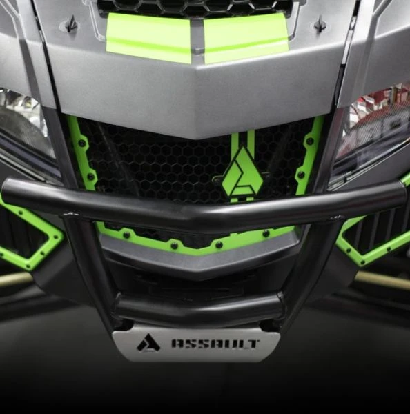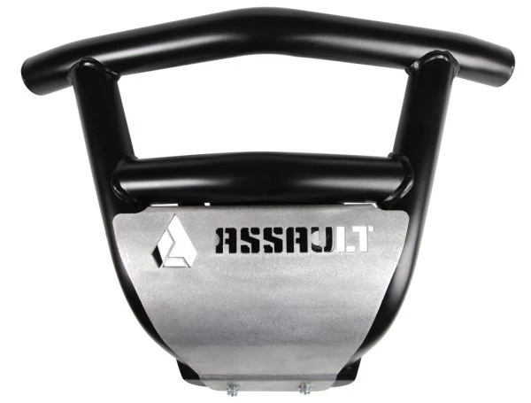 Fitment: (2018+) Textron Wildcat XX. The Assault Industries Striker series front bumper for Textron Wildcat XX is constructed from lightweight, tubular steel for strength and rigidity. The bumper is a direct bolt-on using the threaded holes found on the OEM chassis. The aluminum skid plate features the Assault Industries logo across the top with a line grained raw finish, however it can be anodized or powdercoated to match the theme of the vehicle. The bumper is designed to follow the lines of the front fascia, but does not impede or obstruct the headlights or grill in any way. Includes: Installation hardware.