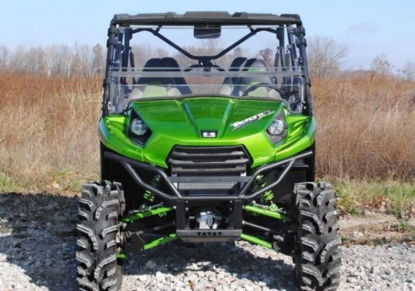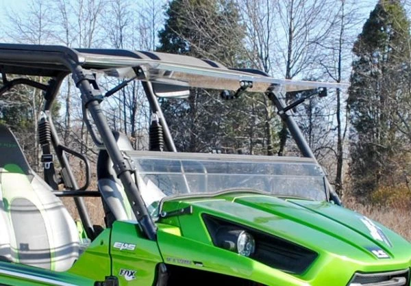 Fitment: (2014-2015) Kawasaki Teryx 800, (2014-2015) Teryx 4 800. New flip windshield is the best windshield on the market. We started with the strongest, thickest, most scratch resistant material and combined it with a great latch that is easy to operate. It even allows the top window to flip up out of the way when needed. The AR Makrolon material is much stronger than your average UTV windshield. The material is hard coated on both sides to provide scratch resistance for years of use. Manufactured in our facility in Madison, Indiana. 3 position windshield allows you to choose your comfort level and protection levels. Go from fully closed, partially open for partial airflow, or fully open for full airflow. Windshield has gas spring supports to help hold the windshield in position when fully opened. Latch mechanism helps hold it securely in place in the closed or partially opened position. Features: 1/4″ Makrolon AR abrasion resistant polycarbonate, Makrolon windshields are hard coated on both sides for extreme durability, Protects against chemical and UV attack, Contoured to hood with full length rubber seal for a great fit, Easy to install – comes with all necessary hardware and instructions, Can be used with soft or hard tops.